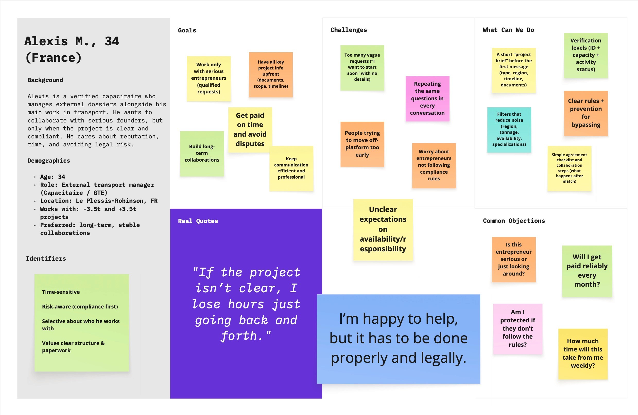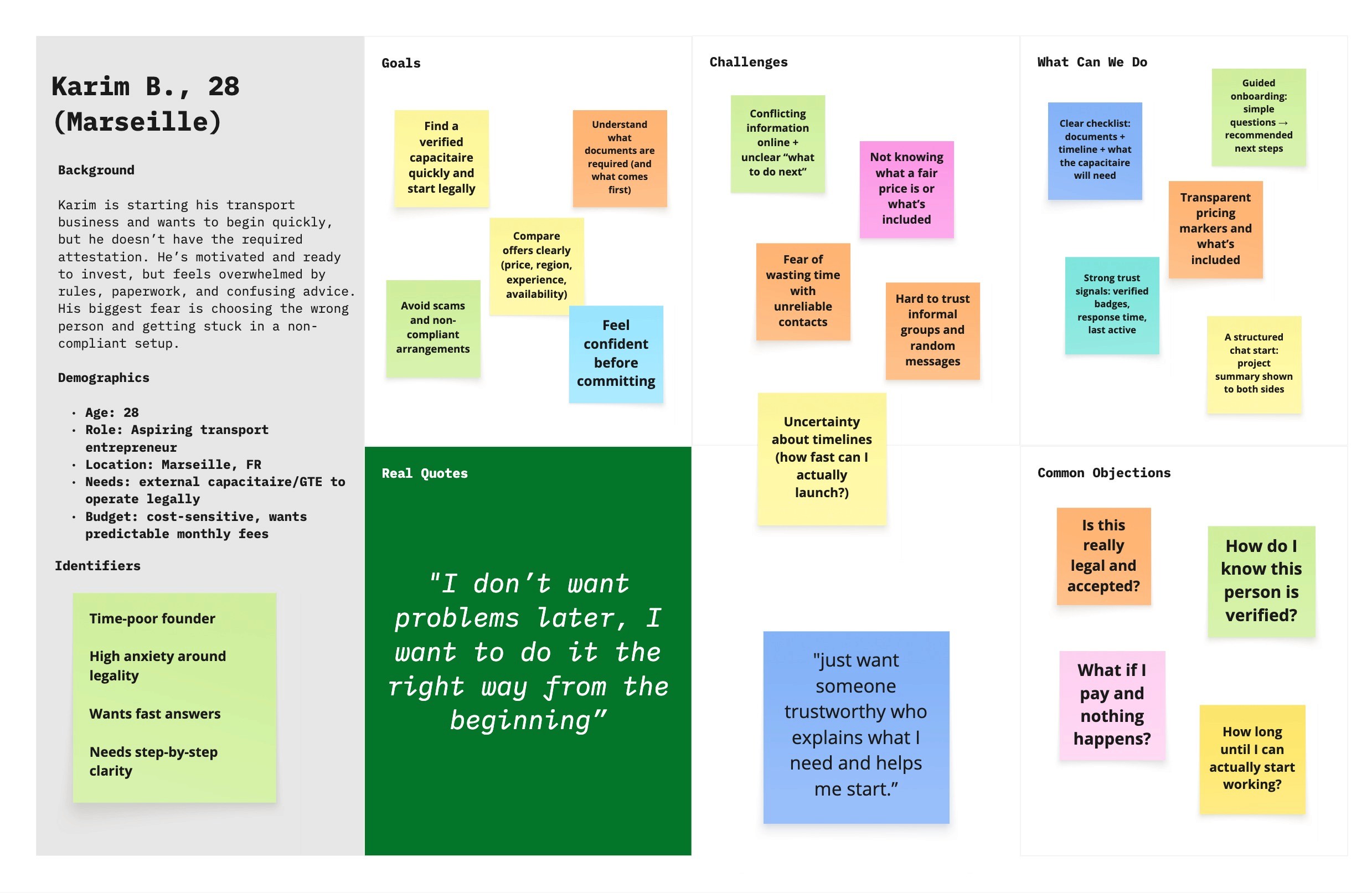 I spoke with new transport entrepreneurs and a few capacitaires to understand how they currently search, what blocks them, and what makes them trust a match. A clear pattern showed up: people don’t just need “a contact” they need a safe, legal, and simple path. Most users feel overwhelmed by regulations, don’t know what documents are required, and worry about scams or non-compliant agreements. They want a straightforward experience where they can compare options quickly and feel confident before starting a conversation.